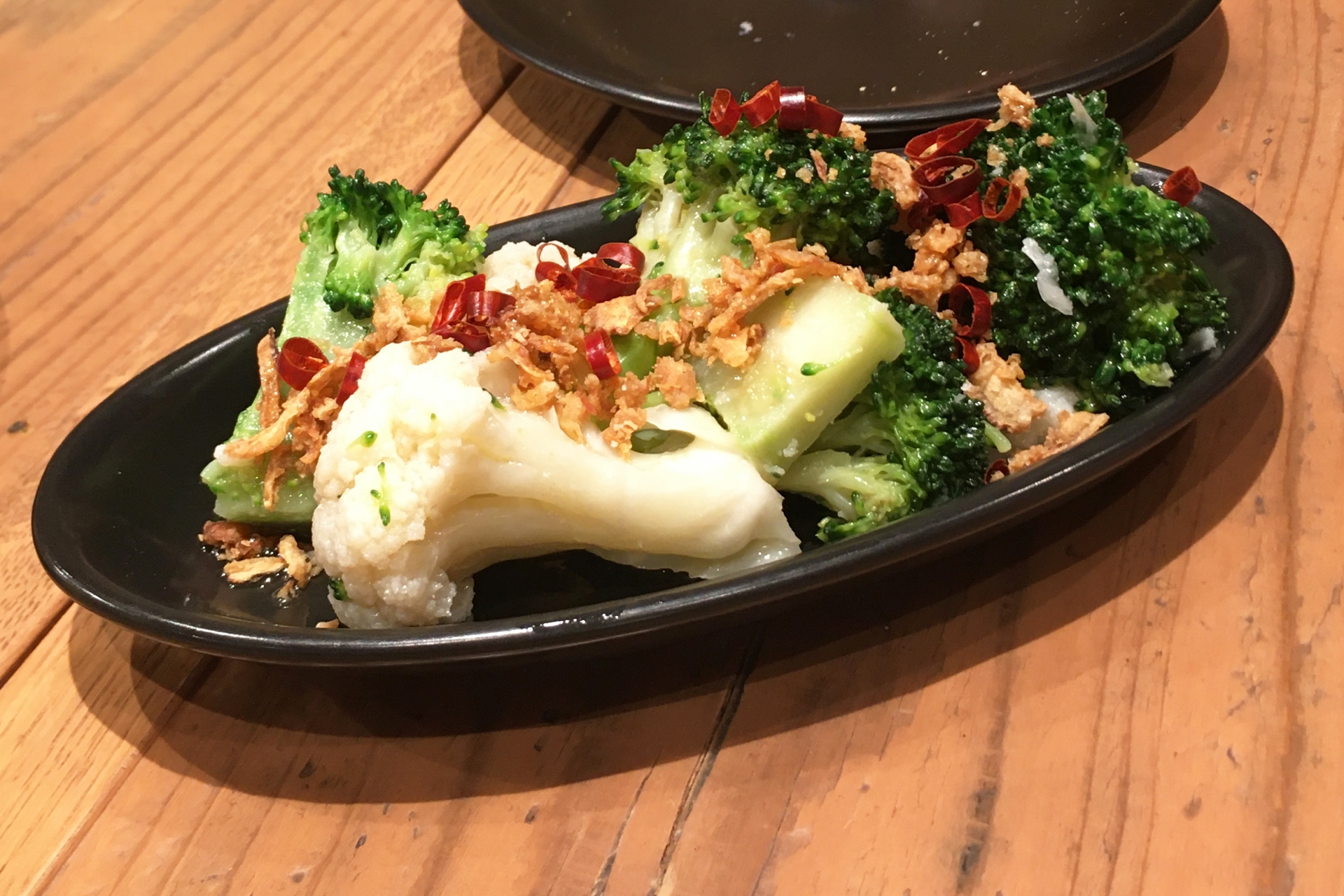 • フライパンにオリーブオイルを熱し、みじん切りにしたガーリックを中火で炒める。ガーリックが金色になったら、火を弱め、ブロッコリーとカリフラワーを加える。